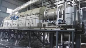 先通過天然氣燃燒器在燃燒室燃燒,將旋轉的回轉滾筒筒體加熱均勻。物料通過定量加料器將物料送入回轉滾筒內部,通過筒體的旋轉和筒體的傾斜度,使物料不斷地向前移動。在移動的過程中,加熱后的筒體將熱量傳遞給物料,使物料溫度上升,產品得到煅燒,煅燒后的產品成高溫狀態從尾端排出。